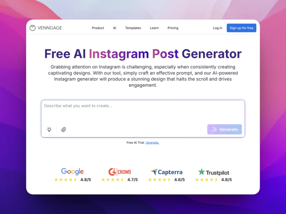 Design polished Instagram posts instantly using AI and ready-made templates.
