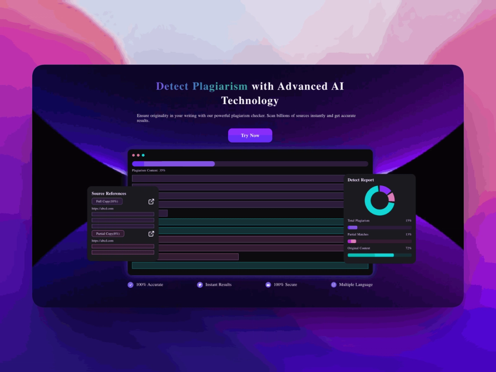 • Advanced Plagiarism Detection: Scan text, files, or links using deep semantic analysis to find copied content. The tool provides clear originality scores along with matched sources for transparent verification.