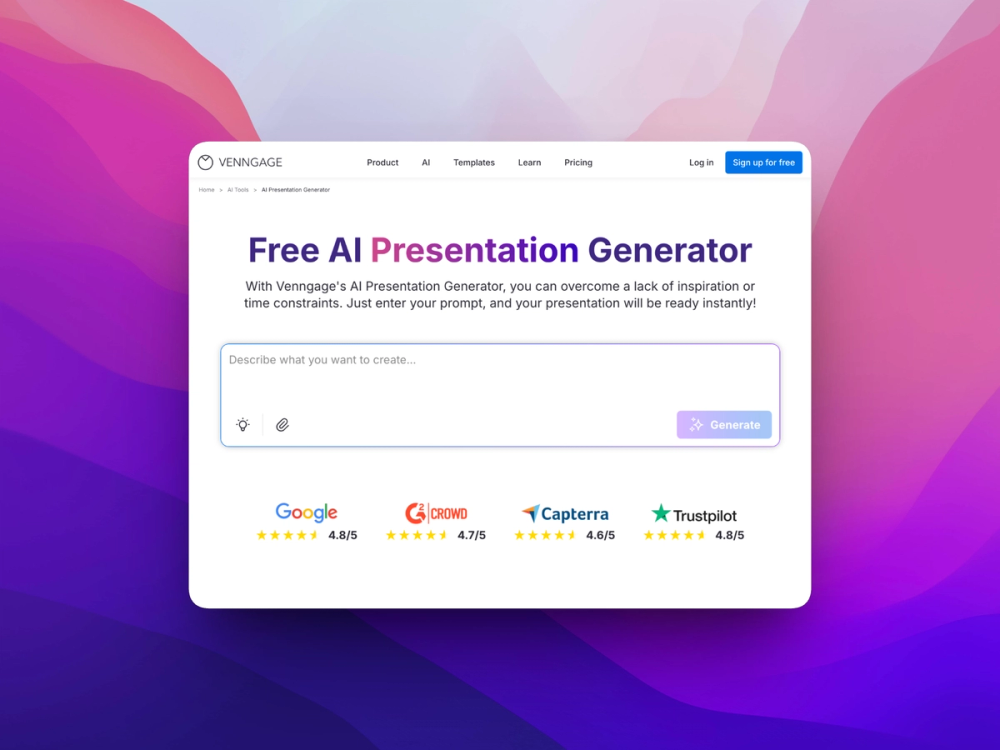 The AI Presentation Generator turns simple prompts into structured, professional slide decks in minutes. Designed for business teams, educators, and marketers, it organizes content automatically, applies consistent layouts and branding, and produces fully editable slides without requiring design or presentation expertise.