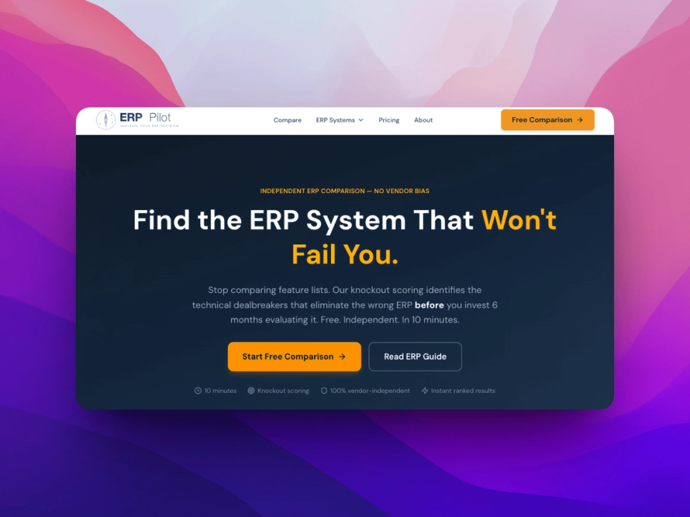 ERP Pilot is a decision-support tool designed to help mid-market companies compare and select ERP systems without relying on vendor input. By analyzing business requirements and applying structured scoring, it quickly filters out unsuitable options and delivers a clear, data-backed shortlist, helping teams avoid long evaluation cycles and costly mistakes.