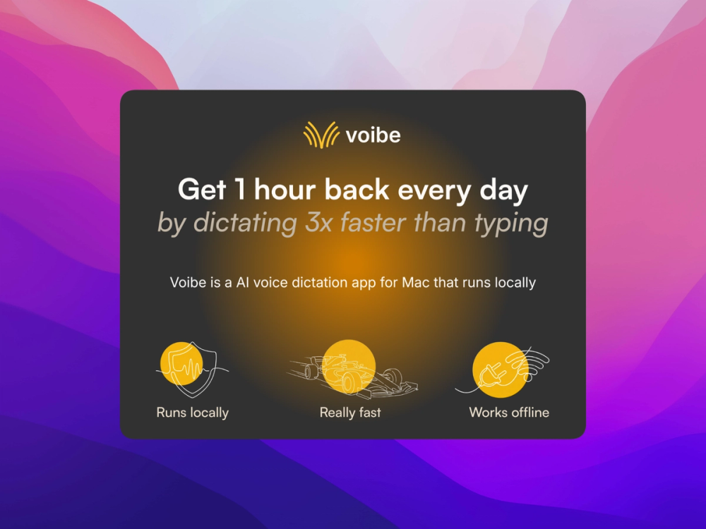 Voibe is an offline voice dictation app for macOS that lets you write at the speed of thought. It works everywhere (Mail, Notes, Browsers, Slack, VS Code, ChatGPT, etc.), making it easy to draft messages, capture ideas, and produce long content without breaking concentration.